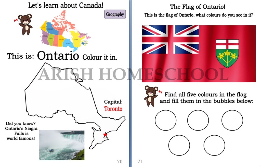 - 1 Workbook that is divided into daily lessons for the month. The lessons include: daily reading, writing, math, science and Canadian geography for every Friday!
