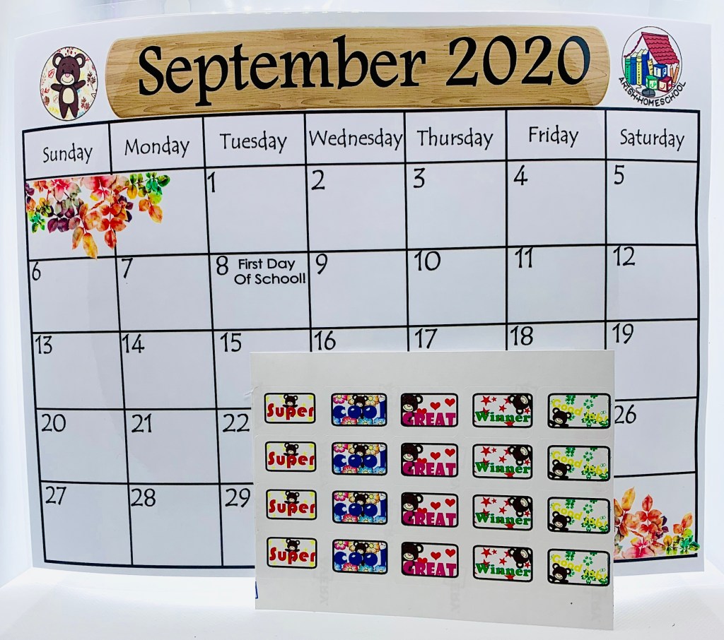 - A monthly calendar that includes stickers to add when lessons are completed for the day.